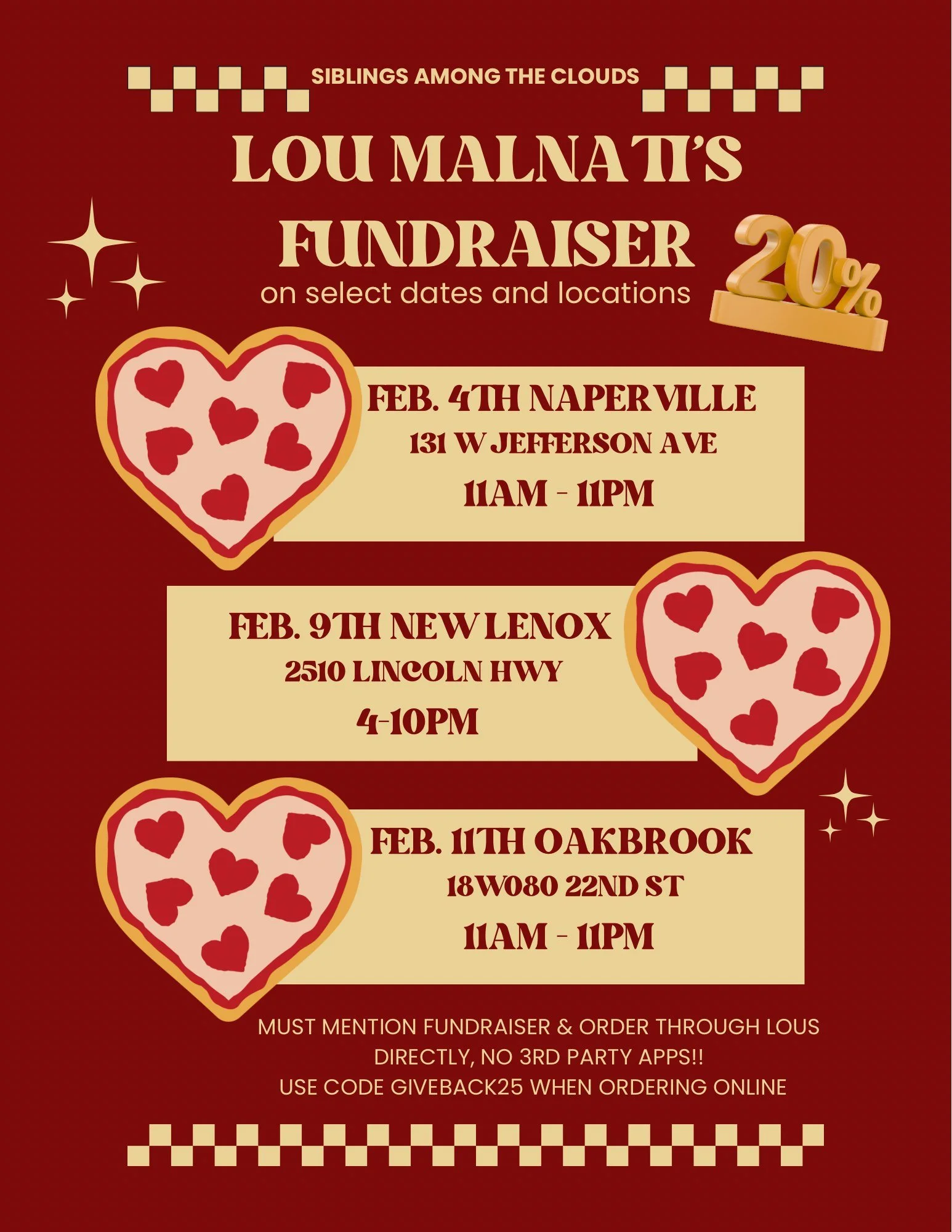 Join us for our 2026 Lou Malnati’s Fundraiser for delicious dinner and supporting a great cause at the same time. All you have to do is show up and eat (don’t forget to mention this fundraiser) and 20% of all orders will be donated to Siblings Among the Clouds. Please see below for locations and times: